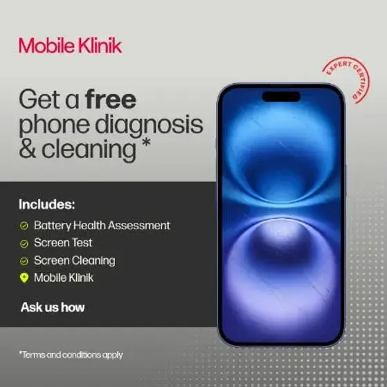Get a free phone check-up in-store today (4). In less than 5 mins our experts will perform: battery health assessment, screen test & screen cleaning* conditions apply.